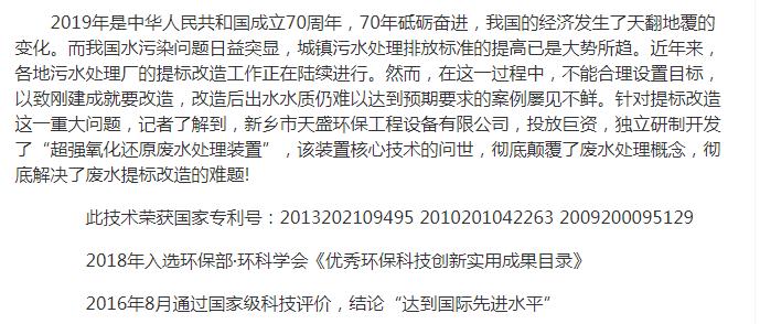 中國高新技術(shù)網(wǎng)發(fā)布:《關(guān)注:解碼科技創(chuàng)新》——新鄉(xiāng)市天盛環(huán)保“超強(qiáng)氧化還原廢水處理技術(shù)”